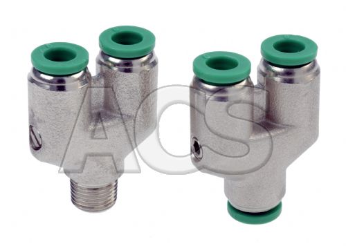 Equal push in and push in to male tapered BSP thread Y fitting to suit metric outside diameter tube 4mm to 12mm and M5 metric to 1/8" BSP threads.