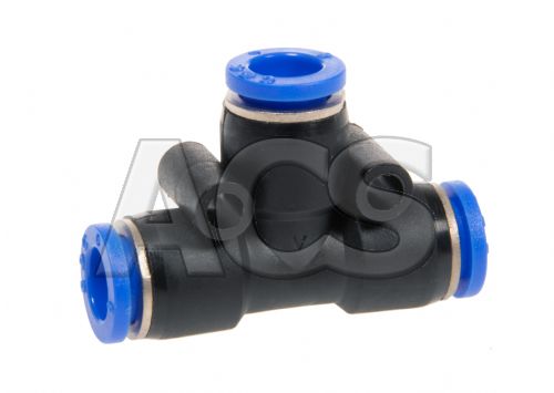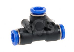 Equal union tee push in fitting suitable for metric outside diameter tubing.