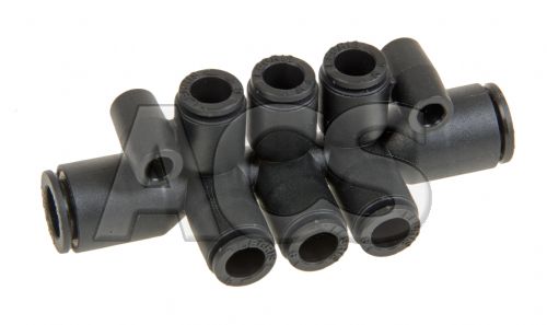 Legris LF3000 polymer 90 degree multiple elbow available with male push in fittings to suit metric outside diameter tube.